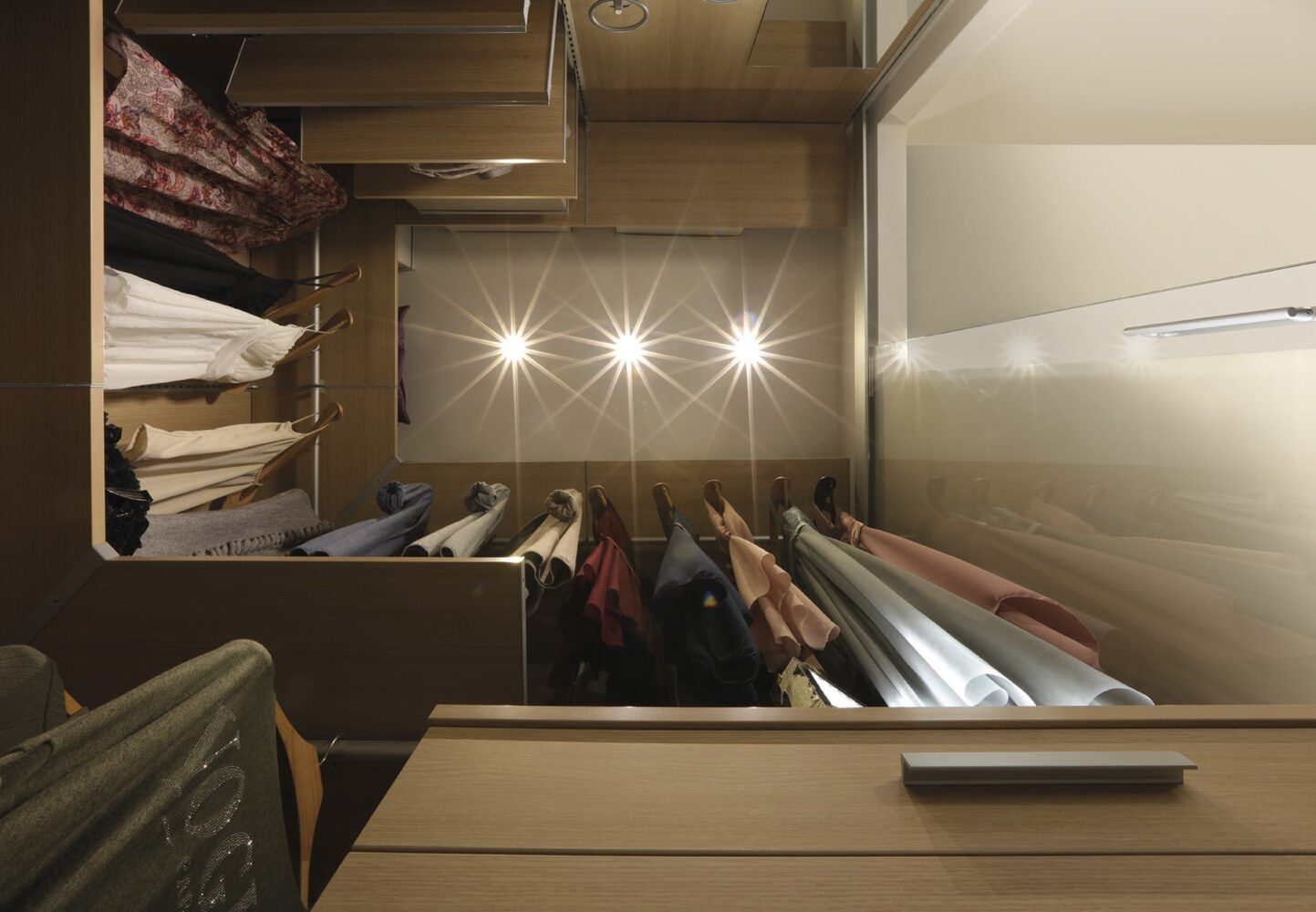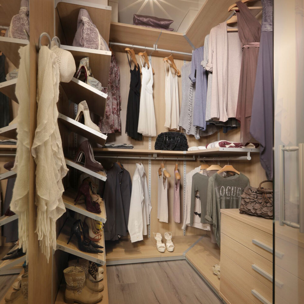 Massimizza lo spazio nel tuo ambiente con la nostra cabina armadio angolare, progettata su tre pareti per adattarsi perfettamente anche negli spazi più piccoli.
