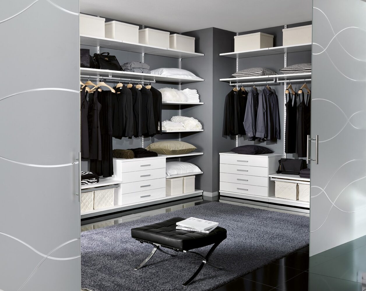 Scopri il valore dell’eleganza discreta con la nostra cabina armadio angolare, sviluppata su due pareti in un ambiente ampio, celato dietro le nostre porte scorrevoli della serie Glass.