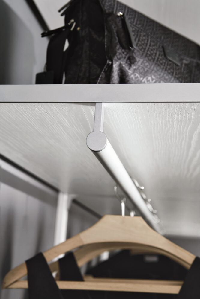 La cabina presentata, è realizzata in finitura BIANCO VENATO con parti strutturali in finitura ALLUMINIO e rappresenta un’ ode alla purezza e alla modernità del design. Senza gli schienali alle pareti, questa cabina armadio offre un’opportunità per personalizzare lo spazio, consentendo di esprimere la propria creatività nella decorazione della parete.