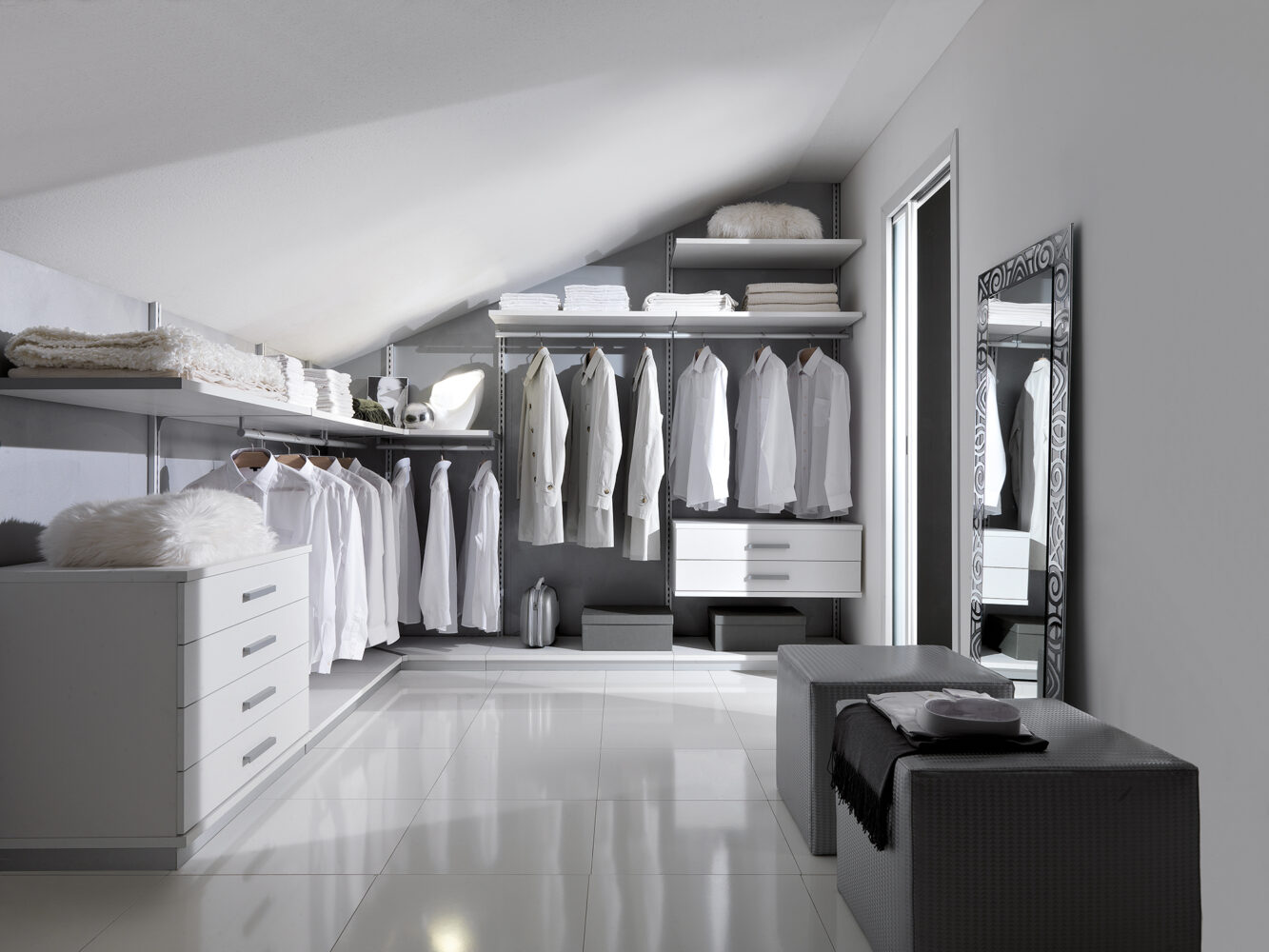Caratterizzata dalla sobria e luminosa finitura BIANCO OPACO abbinato a parti strutturali in finitura ALLUMINIO, questa cabina armadio si integra armoniosamente nell’ambiente mansardato, aggiungendo un tocco di luminosità e modernità. Privata degli schienali per offrire al cliente la libertà di decorare le pareti a proprio piacimento, questa cabina armadio diventa una tela bianca pronta ad accogliere la creatività e lo stile personali. L’ideale per chi desidera realizzare una cabina armadio anche in uno spazio difficile come può essere una mansarda, questa soluzione offre praticità, comfort e design senza compromessi.