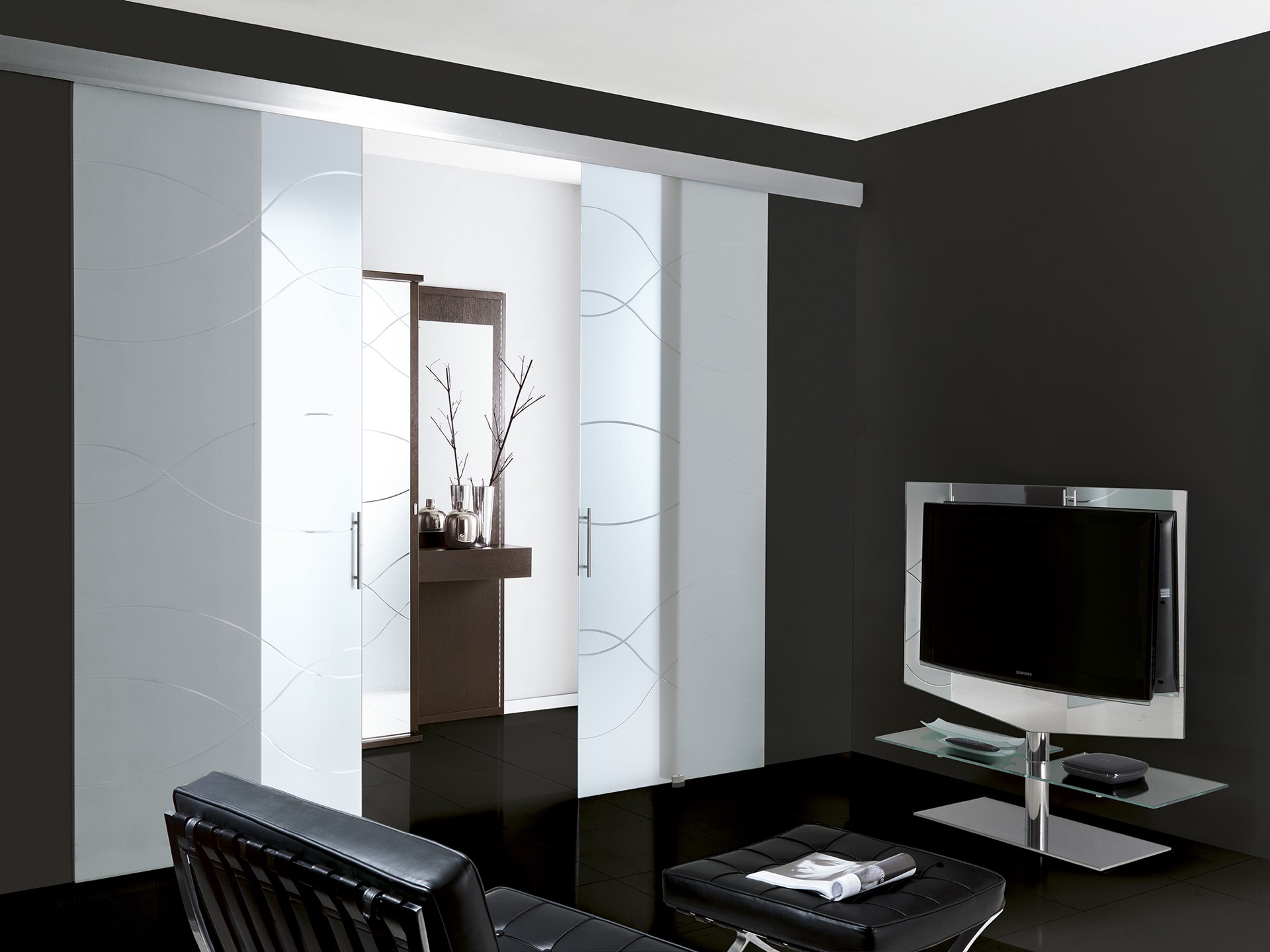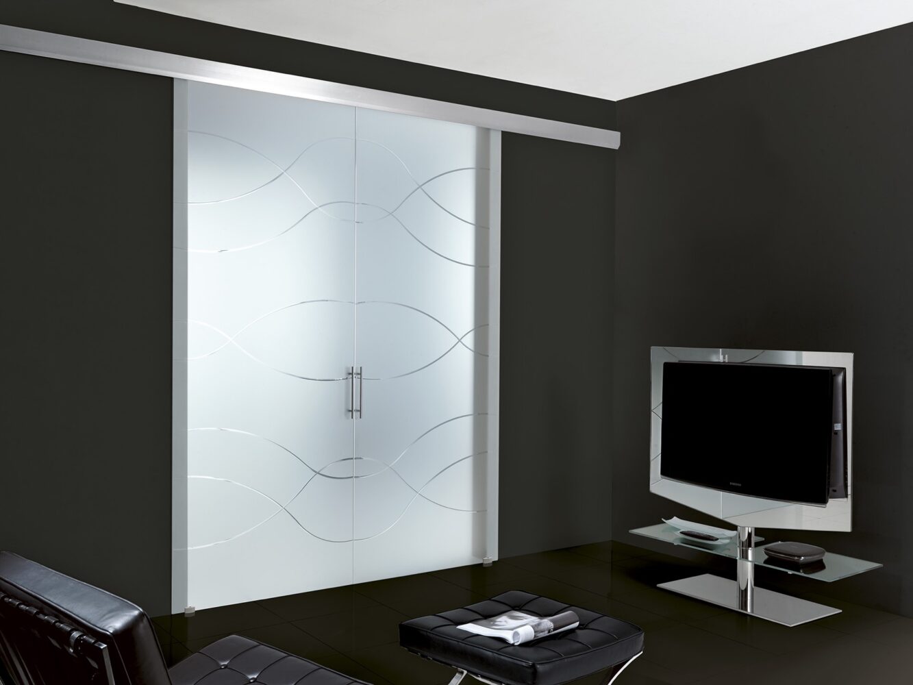 Si tratta di un’installazione di due porte scorrevoli su binario singolo, proposte in finitura VETRO ACIDATO NEUTRO, impreziosito da un’incisione per molatura modello “ONDE“, realizzata per adattarsi alle misure specifiche di ogni vano. Maniglia e binario sono proposte in finitura ALLUMINIO SPAZZOLATO. Questo tipo di porte sono spesso impiegate nella divisione tra cucina e soggiorno, per garantire un generoso passaggio di luce, pur preservando la riservatezza di entrambi gli ambienti.