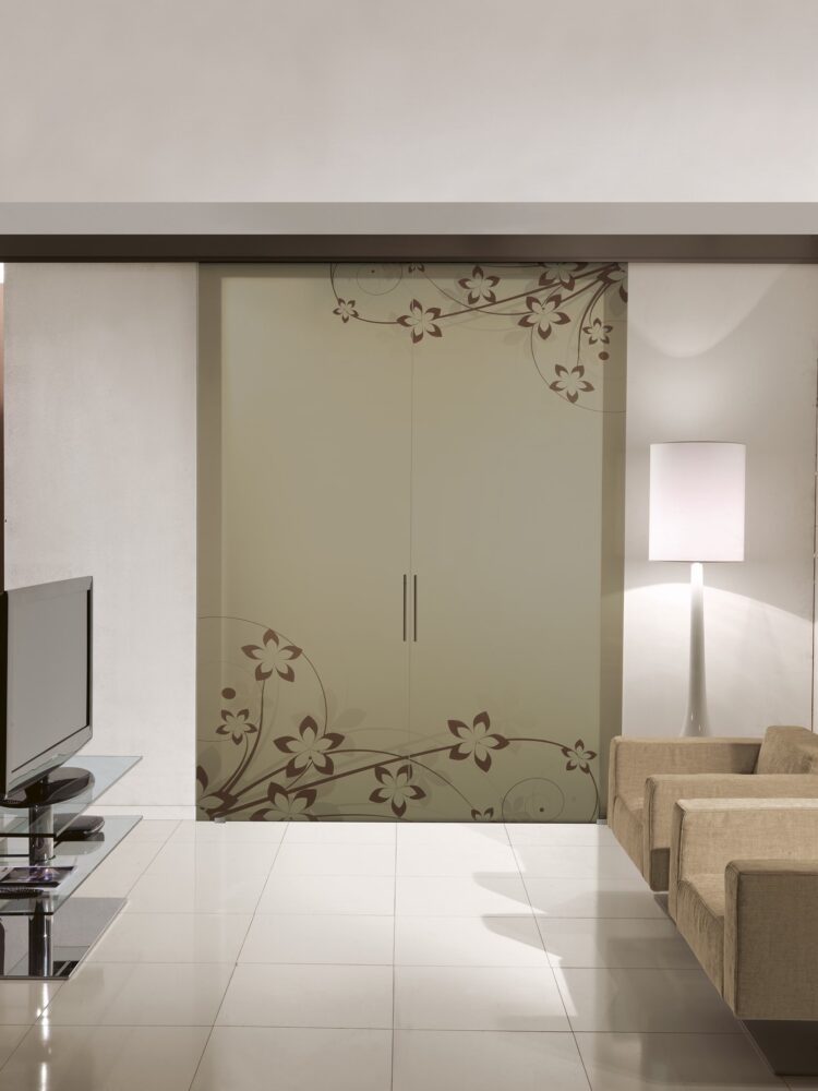 Quelle proposte in questa foto sono due porte scorrevoli su binario singolo, caratterizzate dall’impiego di VETRI in finitura ACIDATO BRONZATO, impreziositi da una STAMPA DIGITALE modello “FLOWER” di colore MOKA. Le maniglie e la mantovana sono state proposte in finitura BRONZO. I vetri acidati, essendo satinati, permettono il passaggio della luce mentre preservano la riservatezza degli ambienti che stanno dividendo. Pertanto, sono ideali per separare la zona giorno dalla zona notte.