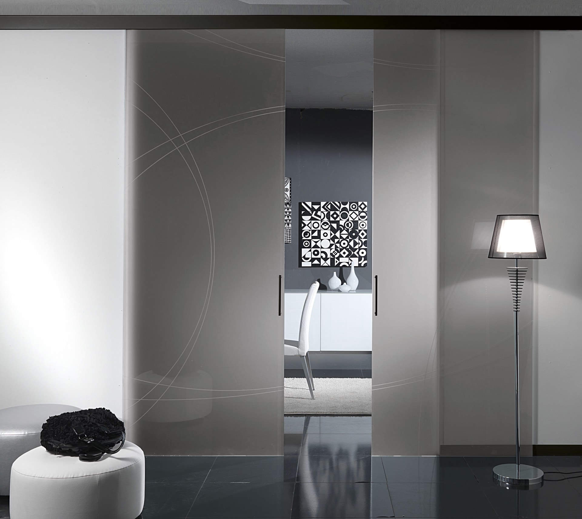Le porte in vetro autoportante, in versione satinata, permettono il passaggio della luce naturale da un ambiente all’altro, preservando l’intimità degli ambienti che separano, in un suggestivo gioco di chiaroscuri di sicuro fascino.