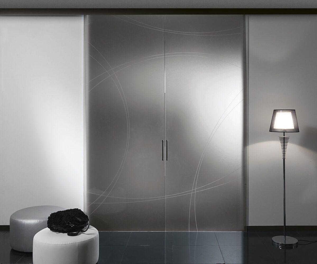 In questa composizione sono presentate due porte con scorrimento su binario singolo a soffitto. I VETRI proposti sono in finitura ACIDATO FUME‘, mentre maniglie e mantovana sono in finitura NERA. I vetri sono stati impreziositi da un’incisione per molatura del vetro modello “ARCHI“. La disposizione del disegno è concepita per iniziare da una porta e continuare sull’altra. Questo disegno, indipendentemente dalla misura delle porte manterrà sempre le sue proporzioni.