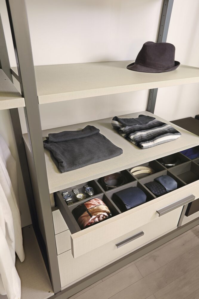 La sua generosa volumetria offre ampio spazio per organizzare il guardaroba con precisione e stile. Esplora la perfezione dell’organizzazione e del design con questa cabina armadio dalle forme nitide e lineari. Realizzata con una finitura EFFETTO TESSUTO abbinata a parti strutturali ANTRACITE, per conferire un tocco di sofisticata raffinatezza. Il design preciso e pulito di questa cabina armadio, unito alla capienza generosa e al pratico cassettino per cravatte, cinture e calzini, la rende un esempio di stile senza compromessi.