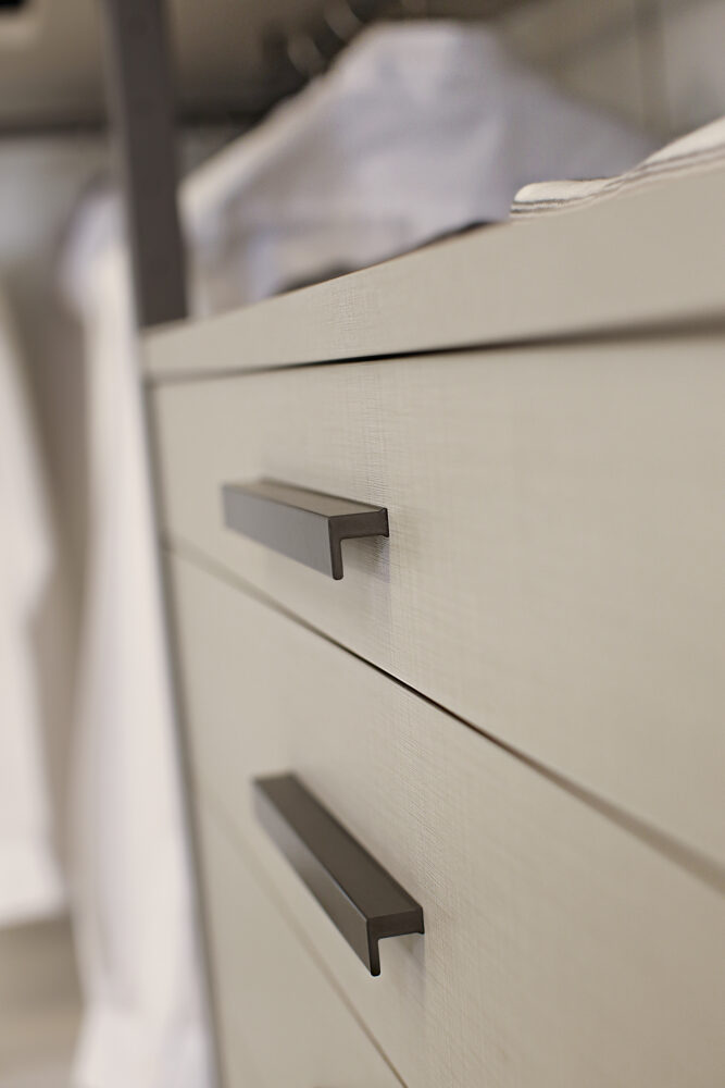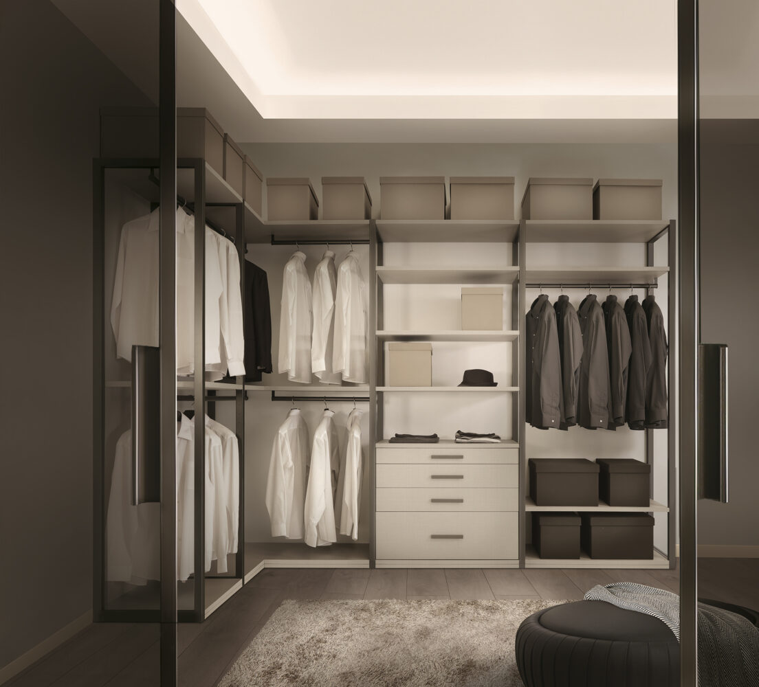 Realizzata con sviluppo angolare su due pareti e caratterizzata da una finitura EFFETTO TESSUTO abbinata a parti strutturali ANTRACITE, che conferiscono un’aura di raffinatezza e sobria eleganza. Le sue linee minimali sottolineano il suo carattere essenziale, mentre ogni capo trova il suo spazio per essere valorizzato al massimo in questa cabina di lusso. Le nostre porte scorrevoli in vetro della serie SLIM custodiscono gelosamente questo ambiente, aggiungendo un tocco di modernità e raffinatezza.