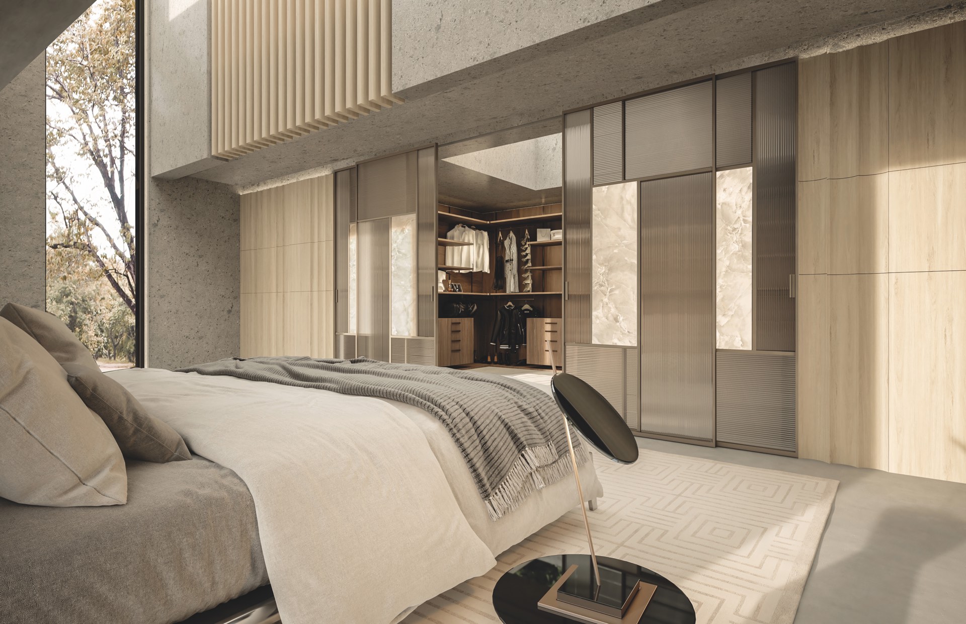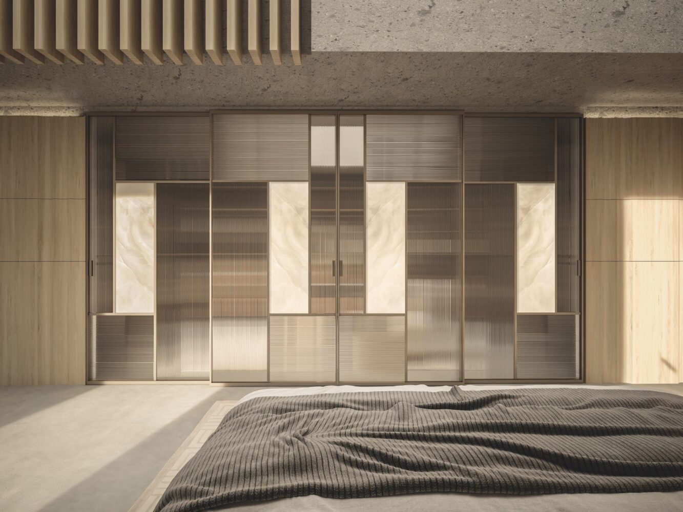 Il telaio è proposto in finitura CHAMPAGNE, abbinato a traversi specifici per suddividere la superficie della porta in campiture asimmetriche. In questa composizione, sono state utilizzate formelle di VETRO CANNETTATO NEUTRO, proposte in sviluppo orizzontale e verticale alternato, insieme a una formella centrale speciale caratterizzata da una STAMPA DIGITALE CON EFFETTO MARMO. Grazie al processo di stampa in altissima risoluzione, si ottiene un livello di realismo così elevato da rendere difficile distinguere tra foto e realtà. Oltre alla texture proposta, offriamo un’ampia scelta di effetti marmorei tra cui scegliere. Questa tipologia di porte, appartenenti alla serie SLIM, la chiamiamo: “multi-formella”.