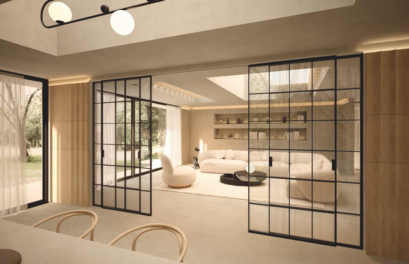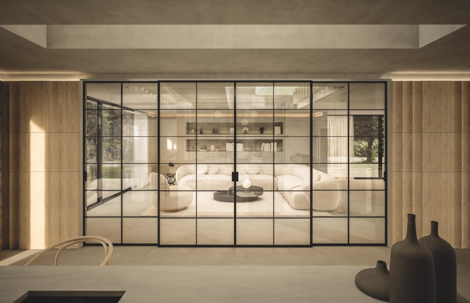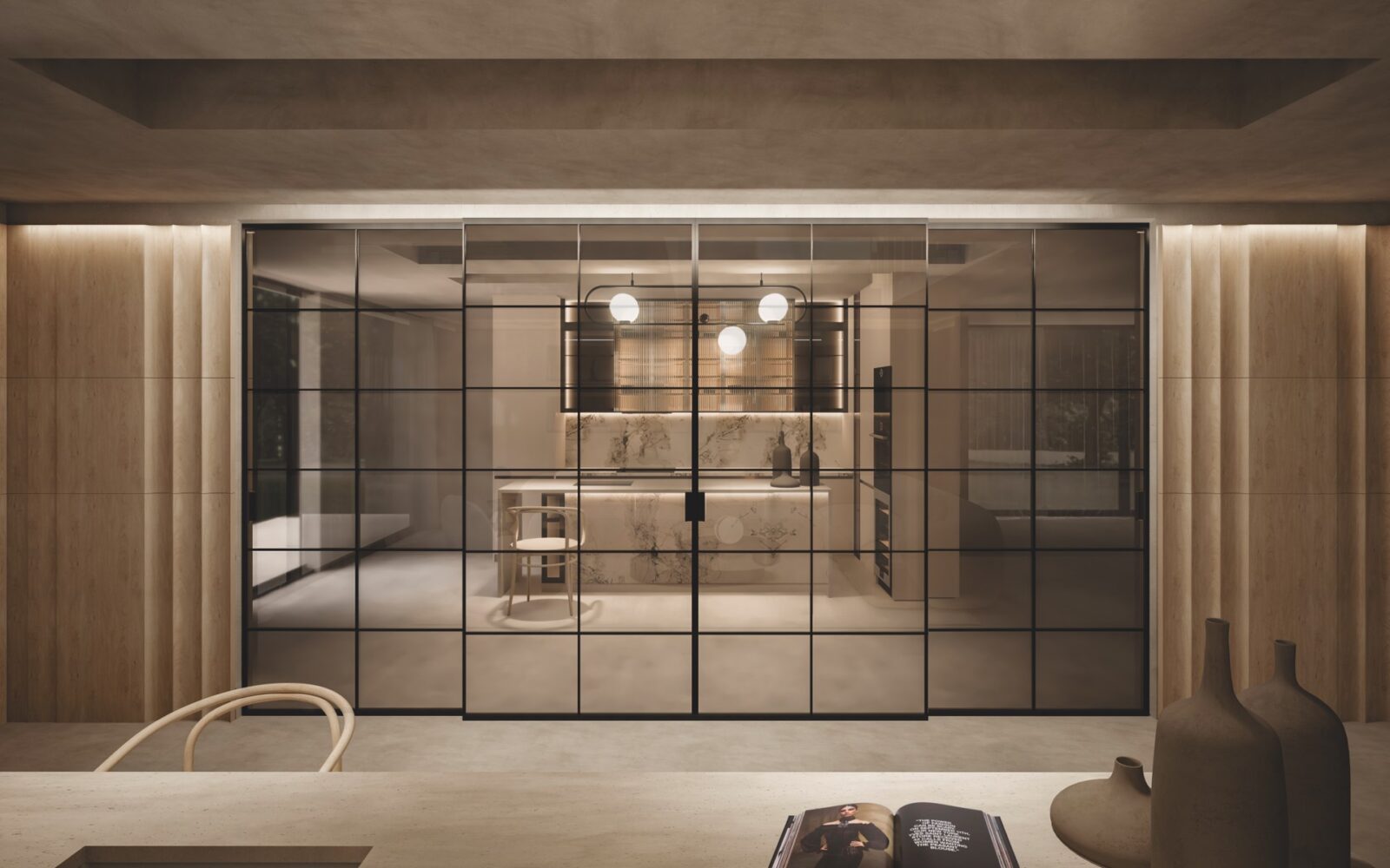 SLIM series industrial-style sliding doors characterize the space, while Stopsol glass panes catch the eye with their dramatic effect, creating a fascinating mix of elegance and awe.